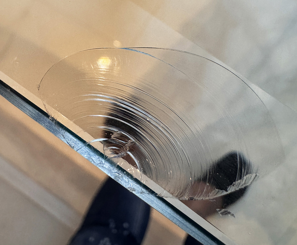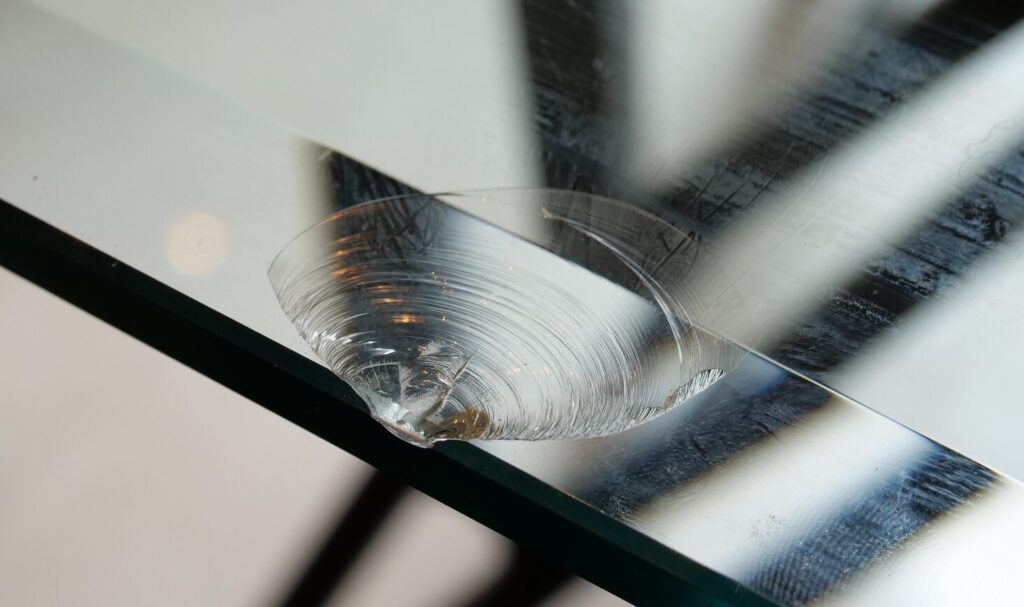 今回ご依頼いただいたような、15mm厚のガラスはすぐに割れるわけではありませんが、次に同様の衝撃が加わった際は、亀裂が伸びて破損するおそれがあります。