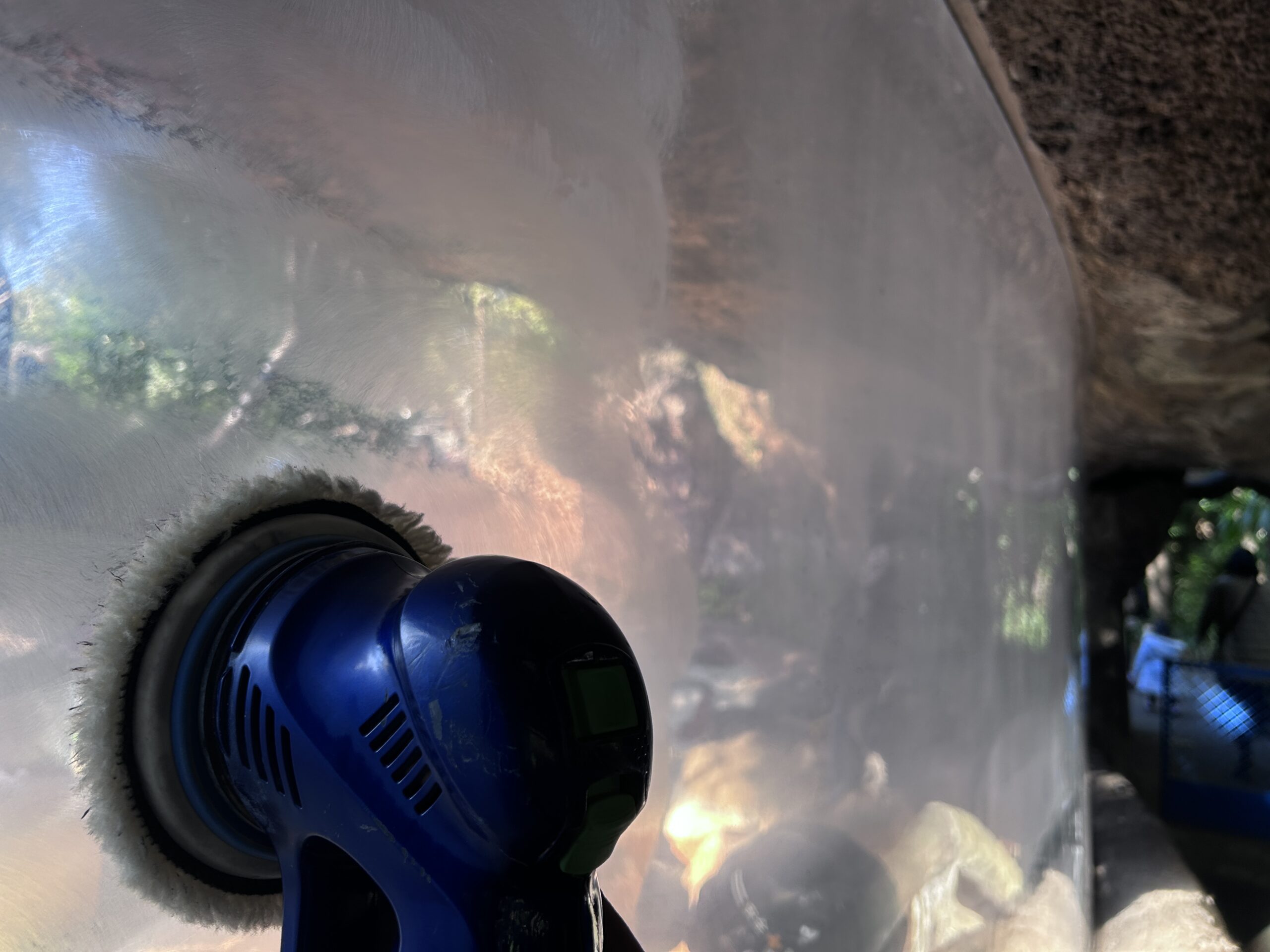 2014年にも一度研磨を行い、当時建築業界では珍しいプロテクション(自己修復)フィルムを施工しました。11年後、2025年に研磨とフィルムの再施工を行いました。トラ放飼場のアクリルは、来園者の接触や清掃、紫外線の影響によって表面が白濁しやすく、視界を妨げる微細な傷が蓄積されていきます。GRSではまず、アクリルの状態を詳細に診断し、素材の厚みや動物への配慮も考慮しながら、ミクロン単位で透明度を回復させる研磨処理を行いました。安全性を確保しつつ、美観と耐久性の両立を実現しています。
