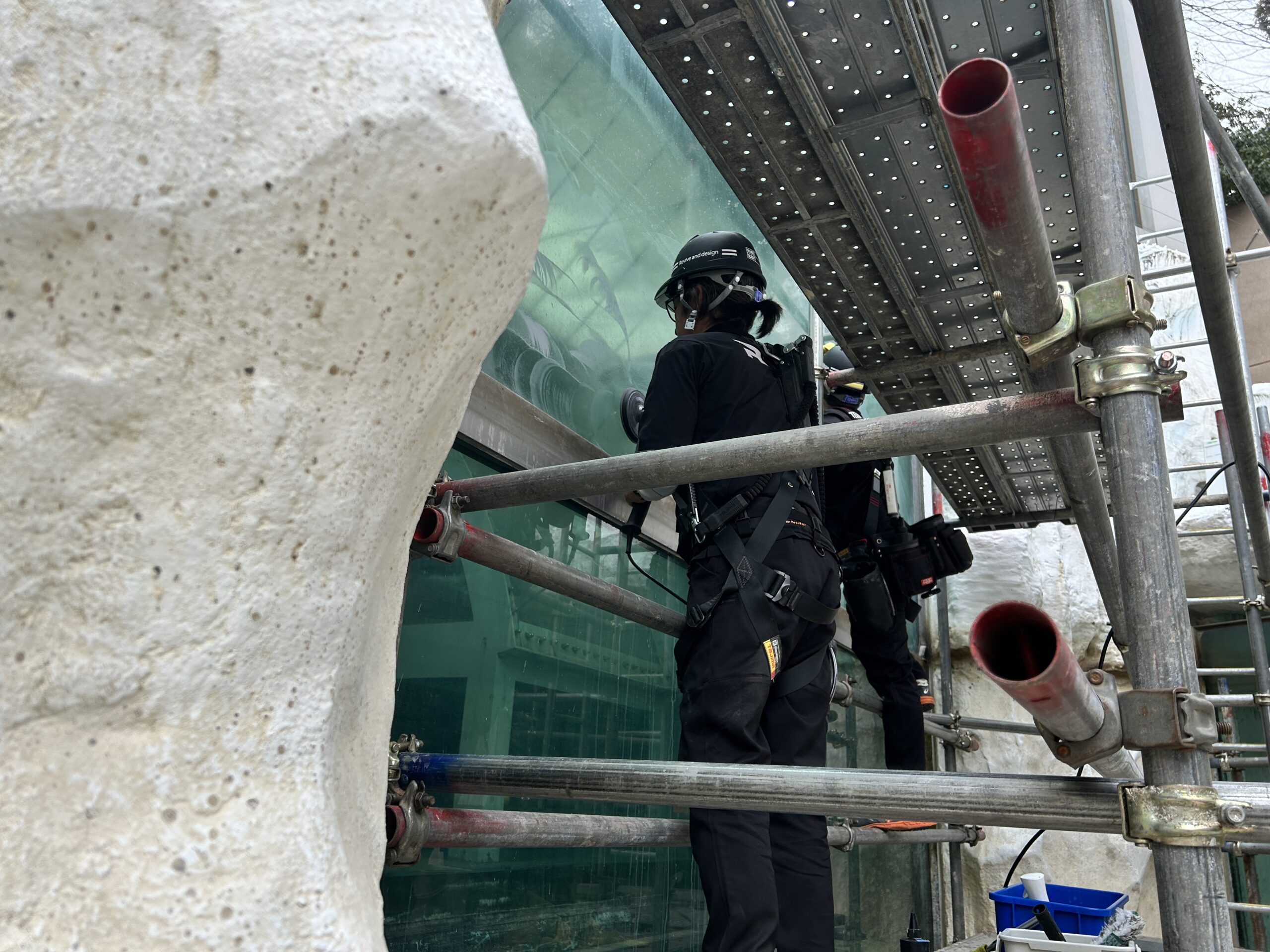 2025年に実施したトラ放飼場のアクリルに続き、ホッキョクグマのガラスの研磨を行いました。長年蓄積した水垢の影響で中の動物が見えない状態になっていましたが、水垢がなくなることでクリアな視界が蘇りました。